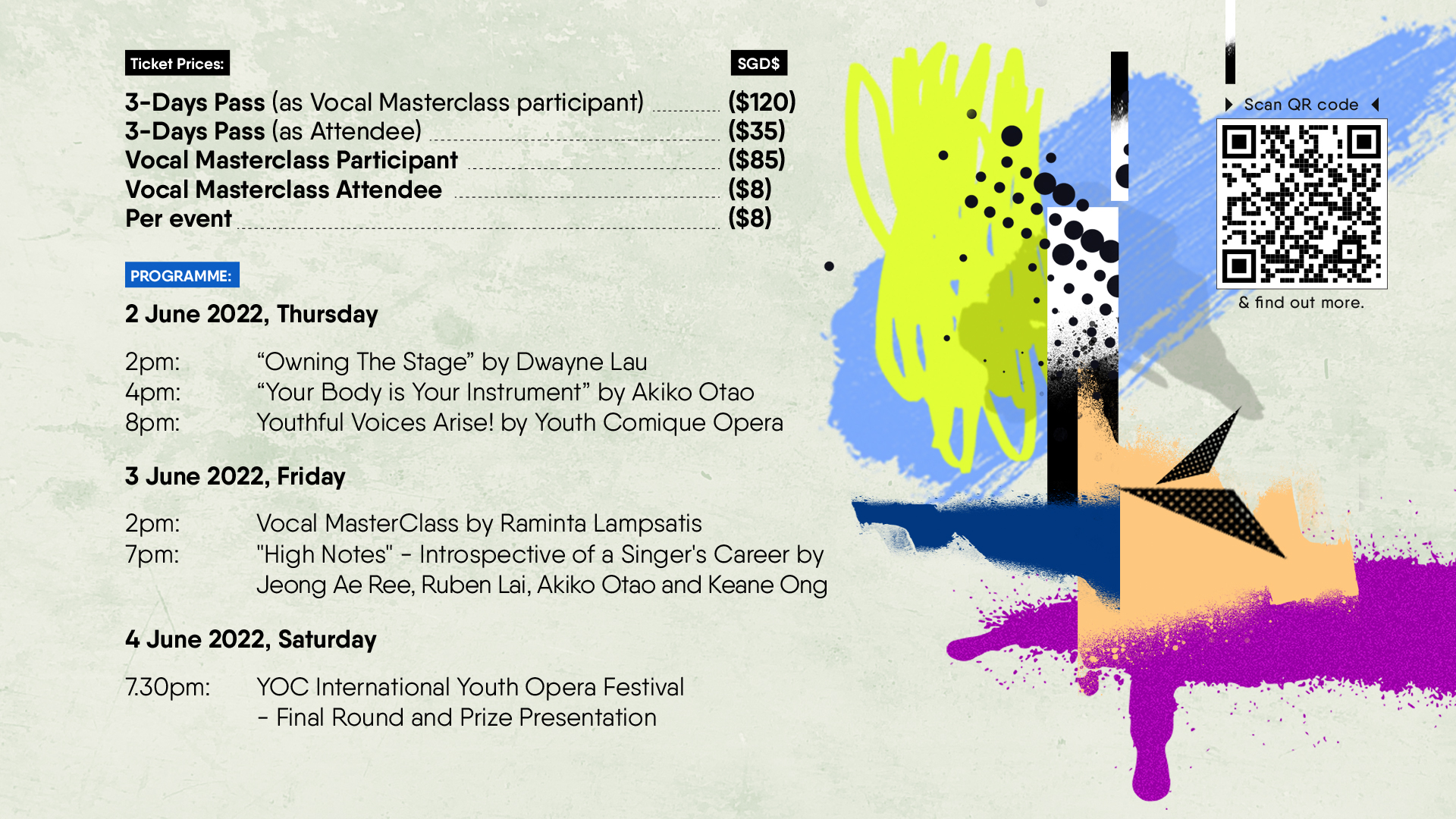 Celebrating the inaugural International Youth Opera Festival is a 3-day event from 2-4 June 2022! Opening with a concert by New Opera Singapore’s ‘Youth Opera Comique (YOC)’, these singers aged 14 and above will introduce audiences to the wonderful world of Opera and art songs. Alongside a Masterclass and vocal-related workshops held throughout the Festival, the culmination of the Festival features contestants and judges from around the world gathering at the Victoria Concert Hall on 4 June 2022, 7:30pm for the Competition Finals and prize-giving ceremony.